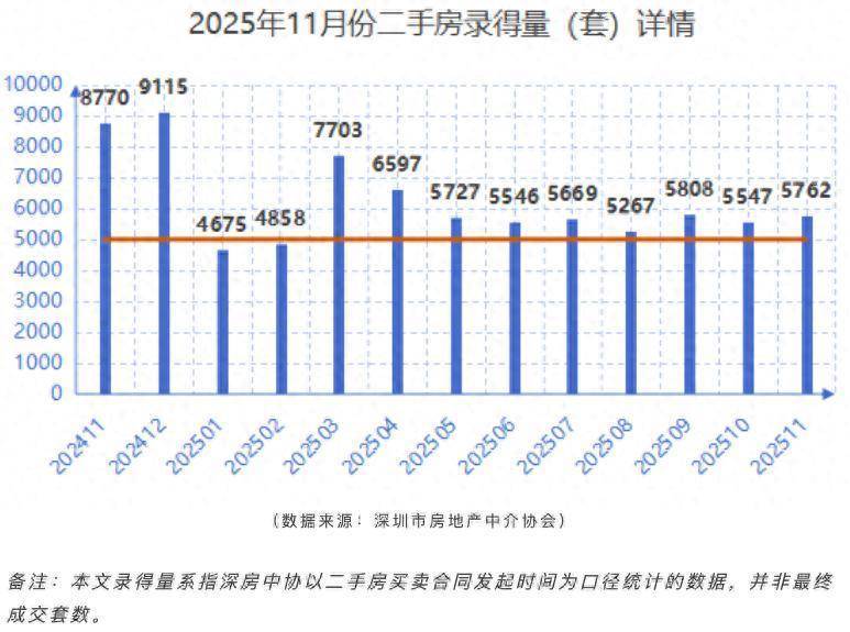 据深圳市房地产中介协会12月1日统计数据西安股票配资平台,2025年11月二手房共计录得5762套,环比增长3.9%,同比下跌34.3%。从月度走势来看,自2025年2月录得低点后,市场成交量已连续9个月维持在5000套以上,并于11月进一步回升至5762套。这表明深圳二手房市场已逐步走出最低谷,交易量进入企稳阶段。成交量的持续稳定,有助于缓和市场情绪,为后续房价预期的稳定提供支撑。