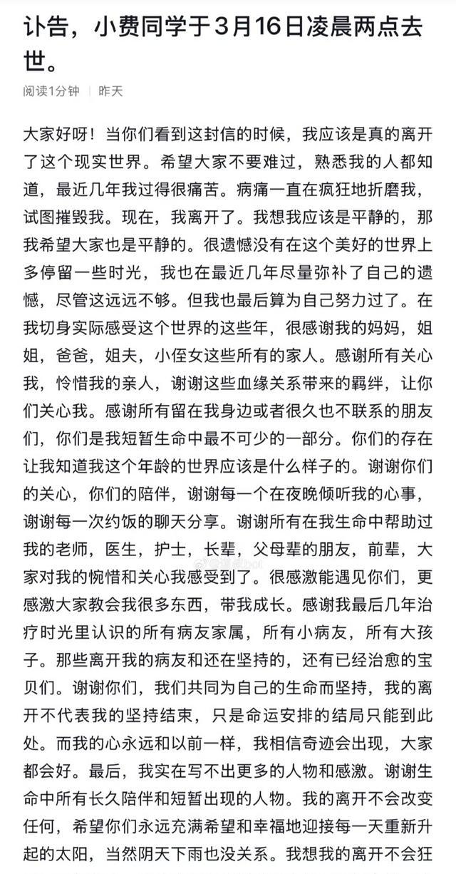 3月18日,网上穿来噩耗,和癌症死磕了整整6年的小姑娘“小费同学”,还是没能留住自己黄金一般的青春,永远停在了21岁的春天里。